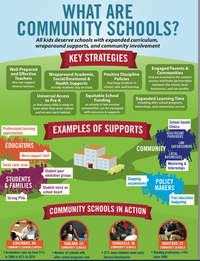One positive outcome from the bygone era of No Child Left Untested is the Community Schools movement. An alternative to the test and punish attempt to reform public schools of the early 2000s, the Community Schools model implements a whole child approach while integrating both tangible and intangible resources of the community. Community Schools are developed with the understanding that every community is different. Recognizing that education is a shared responsibility, Community Schools ensure families, students, and community members have a say in deciding what will work best for student success.